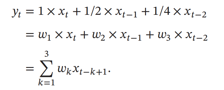 一维卷积经常用在信号处理中,用于计算信号的延迟累积.假设一个信号发生器每个时刻 𝑡 产生一个信号 𝑥𝑡,其信息的衰减率为 𝑤𝑘,即在 𝑘 − 1 个时间步长后,信息为原来的𝑤𝑘 倍.假设𝑤1 = 1, 𝑤2 = 1/2, 𝑤3 = 1/4,那么在时刻𝑡 收到的信号𝑦𝑡 为当前时刻产生的信息和以前时刻延迟信息的叠加: