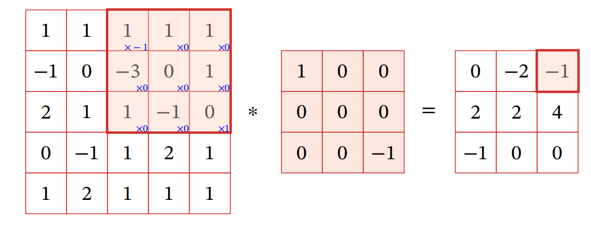 互相关(Cross-Correlation)是一个衡量两个序列相关性的函数,通常是用滑动窗口的点积计算来实现.给定一个图像𝑿 ∈ ℝ𝑀×𝑁 和卷积核𝑾 ∈ ℝ𝑈×𝑉,它们的互相关为