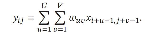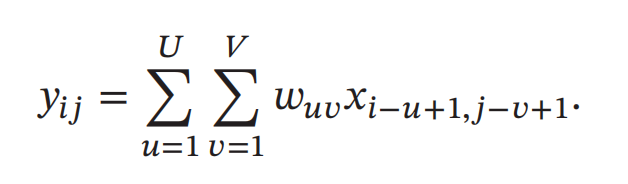 卷积也经常用在图像处理中.因为图像为一个二维结构,所以需要将一维卷积进行扩展.给定一个图像 𝑿 ∈ ℝ𝑀×𝑁 和一个滤波器 𝑾 ∈ ℝ𝑈×𝑉,一般𝑈 << 𝑀, 𝑉 << 𝑁,其卷积为