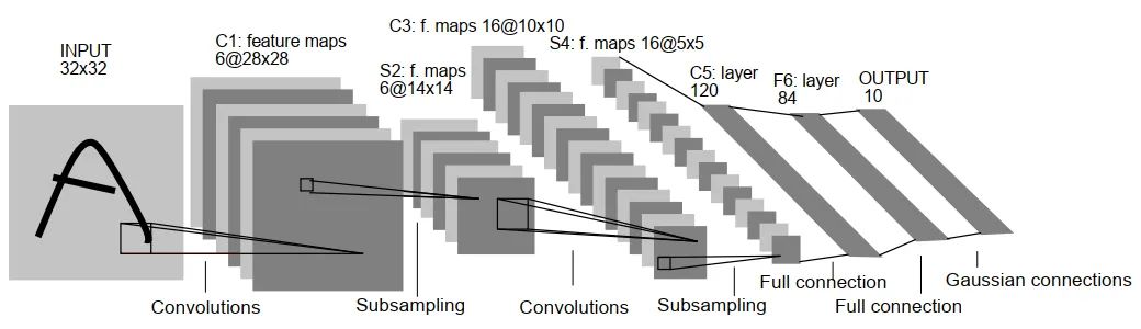 整个 LeNet-5 网络总共包括7层(不含输入层),分别是:C1、S2、C3、S4、C5、F6、OUTPUT。