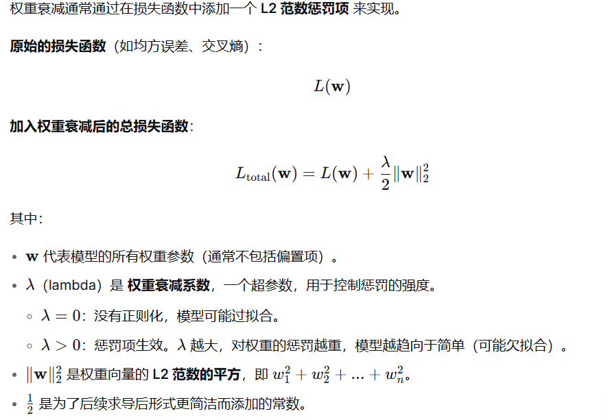 这意味着,在每一步更新中,权重都会先自动乘以一个小于 1 的数,从而“衰减”变小,然后再加上基于数据误差的梯度更新。