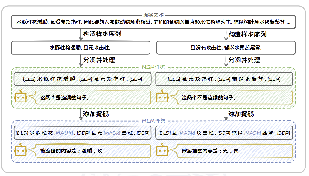 - BERT 先基于给定的原始文本构造多个样本序列,每个样本序列由原始文本中的两个句子组成,这两个句子有 50% 的概率是来自原文的连续句子,另外50% 的概率是随机挑选的两个句子。