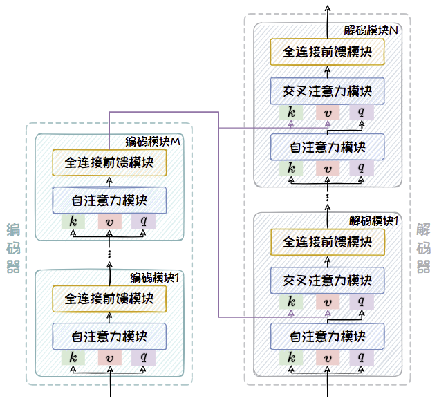 编码器部分与Encoder-only 架构中的编码器相同,由多个编码模块堆叠而成,每个编码模块包含一个自注意力模块以及一个全连接前馈模块。模型的输入序列在通过编码器部分后会被转变为固定大小的上下文向量,这个向量包含了输入序列的丰富语义信息。解码器同样由多个解码模块堆叠而成,每个解码模块由一个带掩码的自注意力模块、一个交叉注意力模块和个全连接前馈模块组成。其中,带掩码的自注意力模块引入掩码机制防止未来信息的“泄露”,确保解码过程的自回归特性。