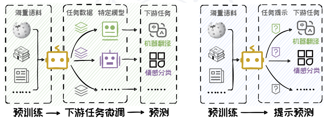 传统的自然语言处理研究遵循“预训练-微调-预测”范式,即先在大规模语料库上作预训练,然后在下游任务上微调,最后在微调后的模型上进行预测。随着语言模型在规模和能力上的显著提升,一种新的范式——**“预训练-提示预测”**应运而生,即在预训练模型的基础上,通过精心设计Prompt 引导大模型直接适应下游任务,而无需进行繁琐微调,如图所示。