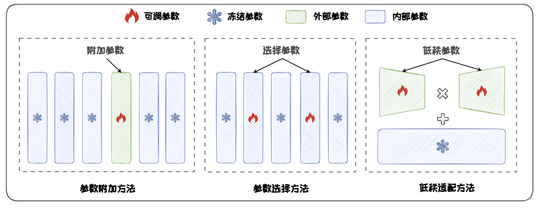 参数高效微调(Parameter-Efficient Fine-Tuning,PEFT)旨在避免微调全部参数,减少在微调过程中需要更新的参数数量和计算开销,从而提高微调大语言模型的效率。