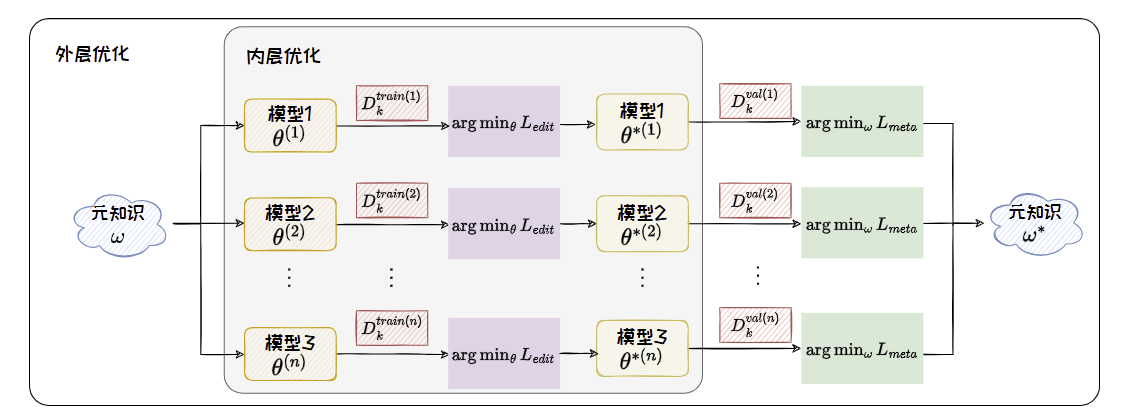 元训练过程可以看作一个双层优化问题: 内层优化是模型在不同编辑任务上的优化,外层优化是元知识在验证集中的编辑任务上的综合优化。