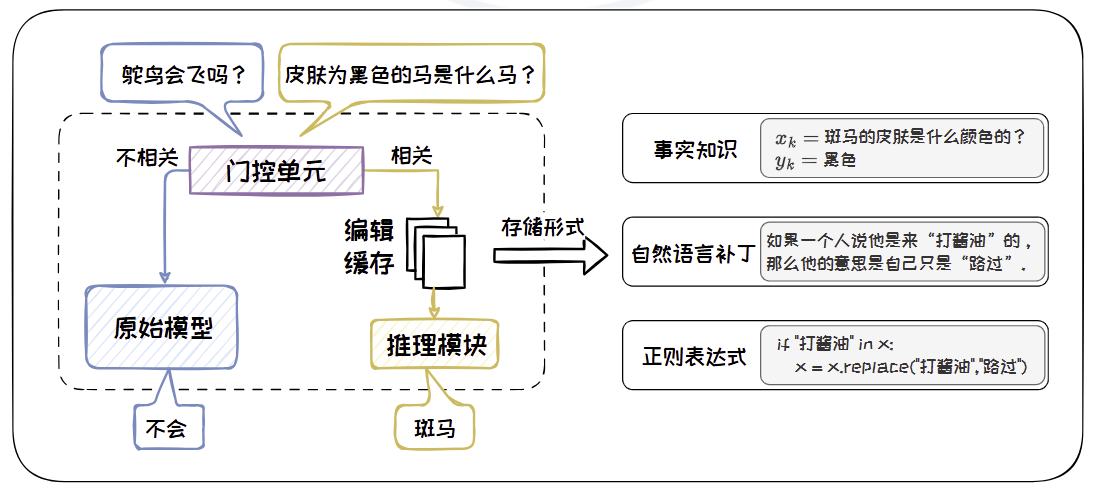 - 门控单元:用于判断输入问题与编辑缓存中的知识的相关程度,可通过分类或噪声对比估计等任务进行训练。