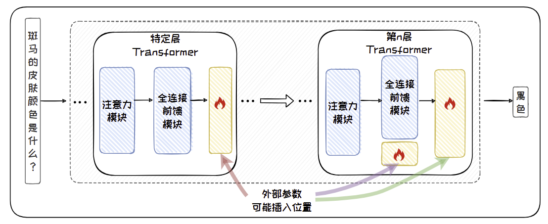 这类方法的思想与参数高效微调中的参数附加方法类似,都是将外部参数插入到模型中的特定位置,冻结原始模型,只训练新引入的参数以修正模型输出。