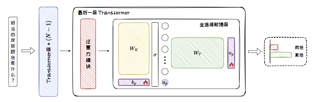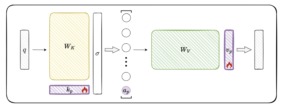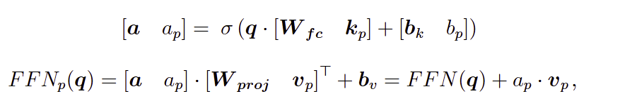 T-Patcher 在全连接前馈层中加入额外的键值对向量作为补丁,通过训练补丁参数从而实现模型编辑。补丁的形式如图所示,它主要包括一个键向量kp、一个值向量vp 和一个偏置项bp。