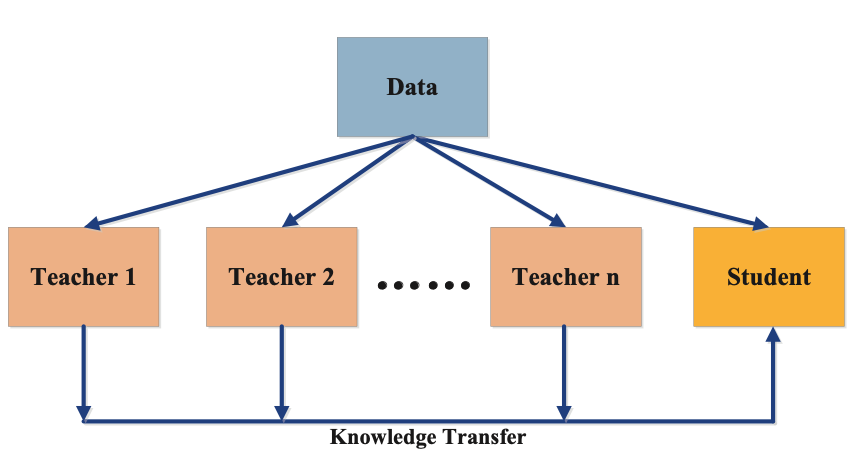 来自多位教师的知识可以合并为所有模型的平均响应。通常从教师那里传递的知识类型基于逻辑和特征表示。多位教师可以传递不同类型的知识。