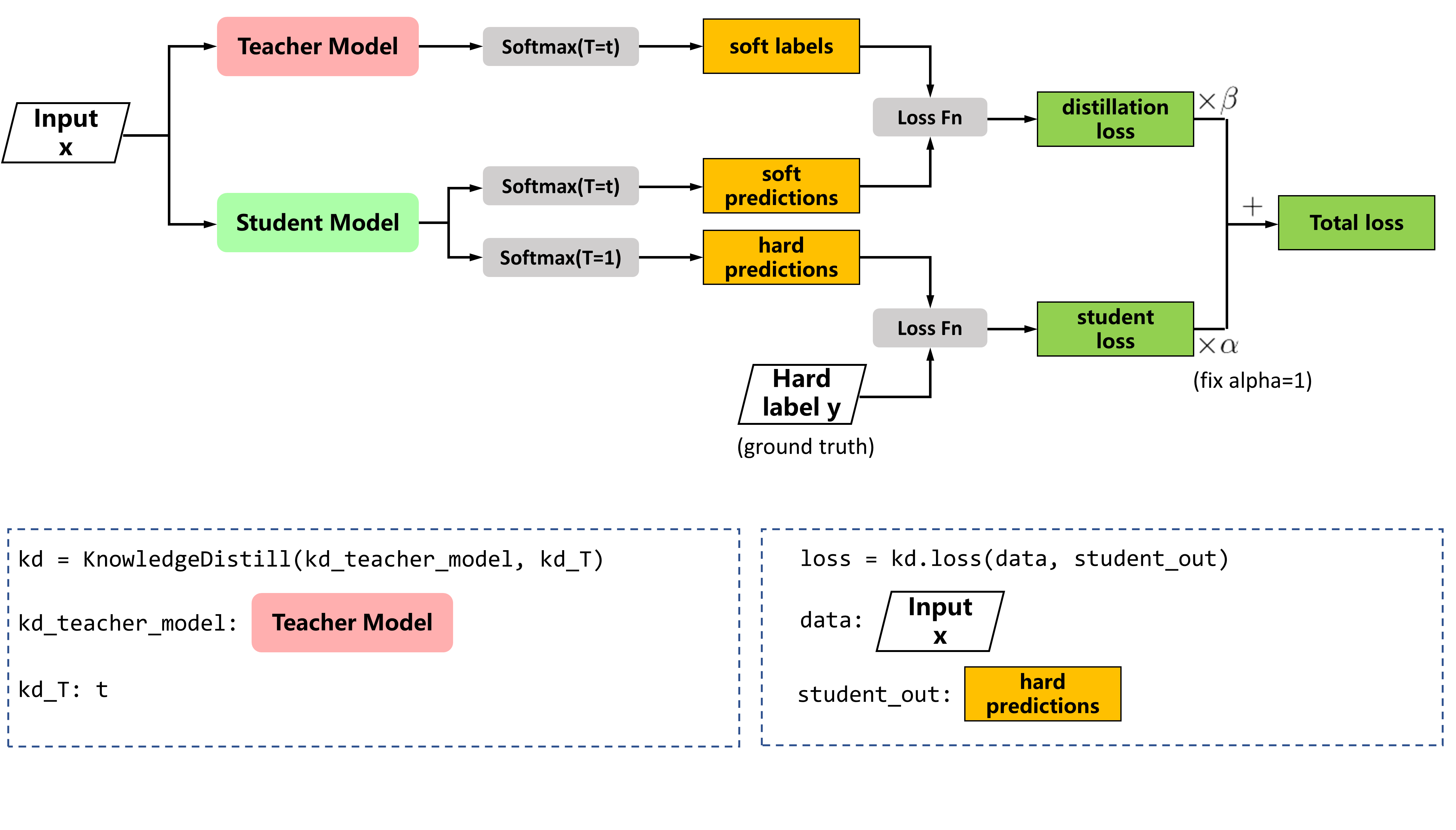 首先有一个已经训练好的教师网络(Teacher model),把很多数据(input)喂给教师网络,教师网络会给每个数据都给一个温度为T的时候的softmax(文中soft labels);